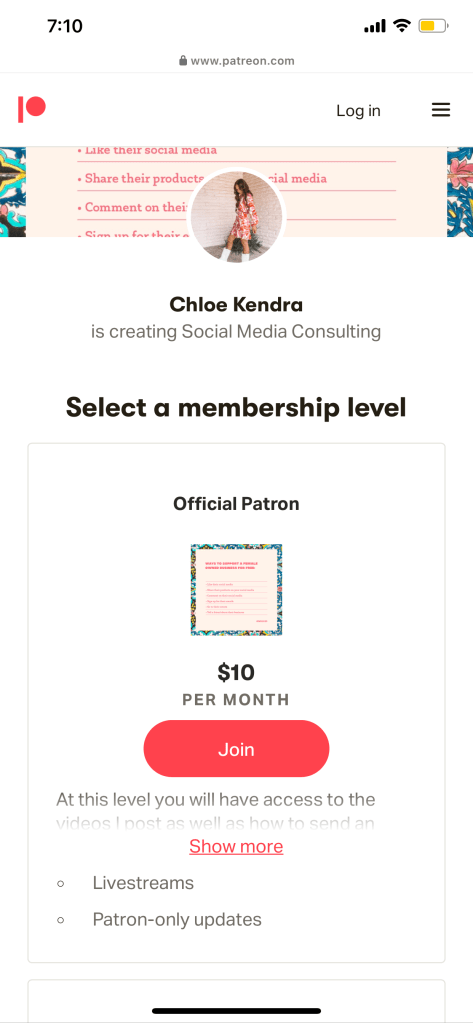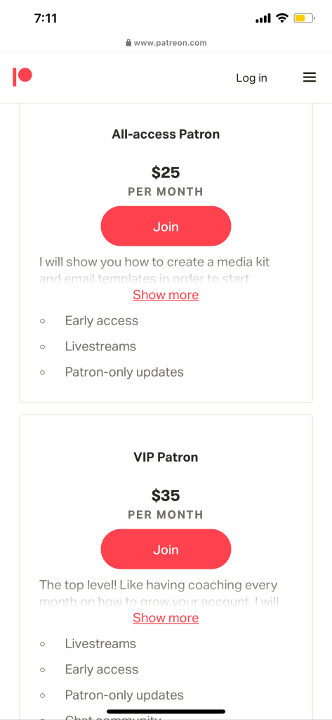I have $10, $25, and $35 levels. The higher the level, the more benefits you get. If you are so wanting to go full time blogging and influencing I would highly suggest the two higher level packages.